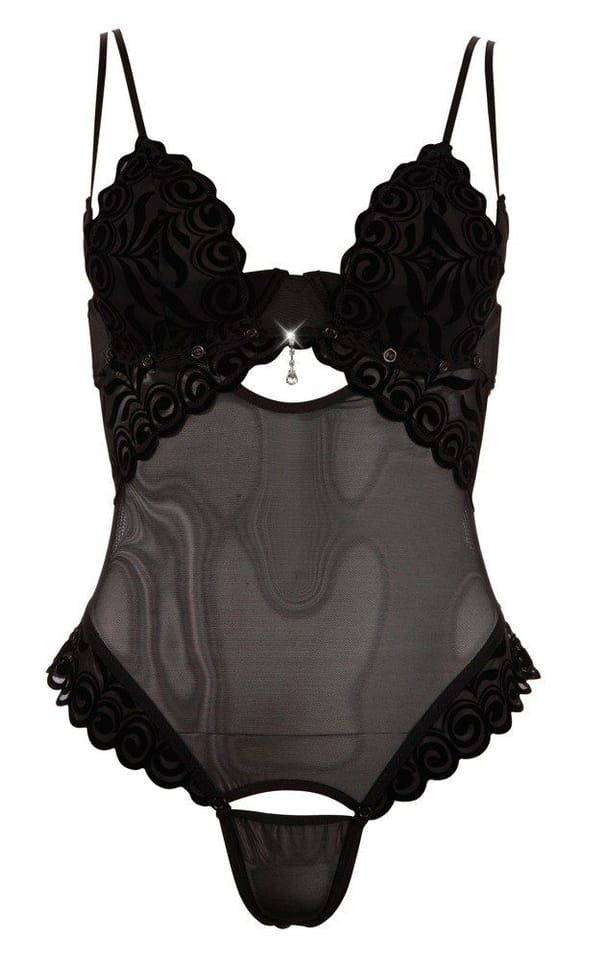 Czarne eleganckie body wykonane z siateczki Powernet. Miseczki oraz część majteczkowa odpinane. W okolicach biustu ozdobny, błyszczący kamyczek. Dwie pary regulowanych ramiączek z których jedna jest odpinana razem z miseczkami. Miseczki lekko usztywnione fiszbinami. Siateczka: 90% poliamid, 10% elastan; Nadruk: 90% poliester, 10% elastan.