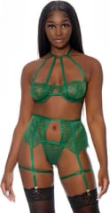 - Komplet zawiera: biustonosz z fiszbinami na szyi, pas do pończoch, majtki