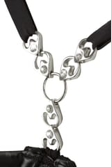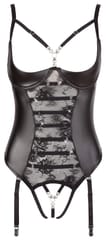 Beautiful design with ingenious insights!Sensual string body with adjustable and detachable suspender straps and a slightly padded shelf bra with hook fastener at the back. With delicate strap details and elaborate rhinestones in the cleavage area. The semi-transparent lace inserts at the front allow lascivious insights. Above that, there are additional refined lacings with silver rings and stretchy straps. The crotch is completely open and features exciting strap details and rhinestones as well.90% Poliester, 10% elastane; lace 90% polyamide, 10% elastane.