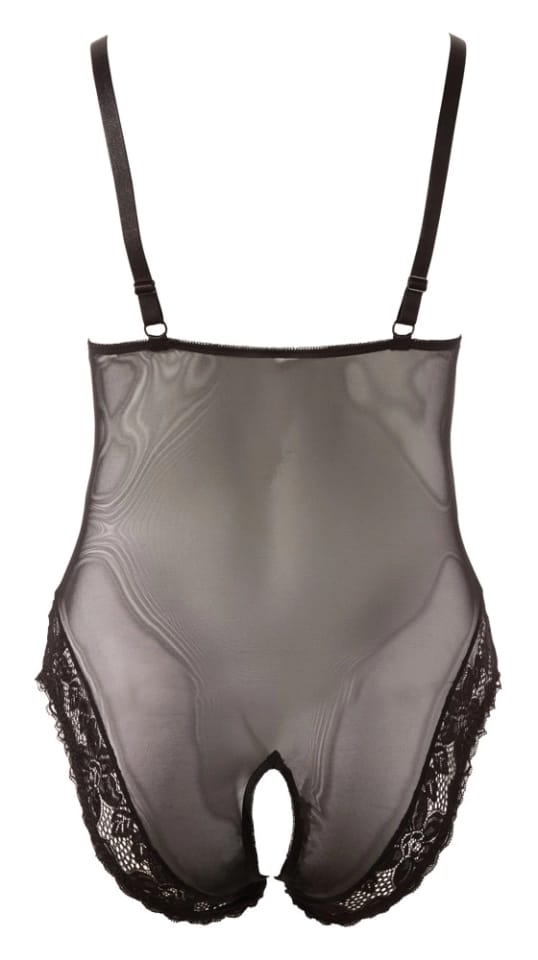 Czarny siateczkowe body z rozcięciem w kroczu obszyte przepiękną koronką. Regulowane ramiączka.