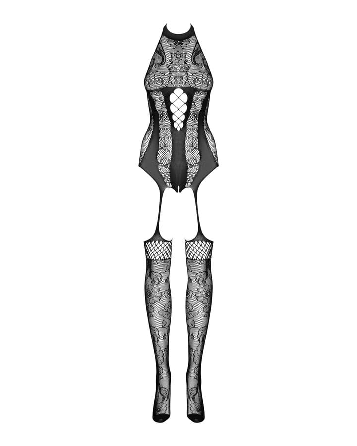 Otulające ciało bodystocking z dopasowującego się materiału. Model bogato zdobią roślinne motywy zestawione z siateczką. Intrygujący design, który przyciąga spojrzenia.- bodystocking w czarnym kolorze- fason odsłaniający plecy- otwarty krój- roślinny motyw- miękka i elastyczna tkanina- 90% nylon, 10% elastan- zaprojektowano w UE