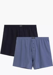 Luźne bokserki odznaczają się uniwersalnej wysokości talią i nogawkami długości do połowy uda. Wykończone w pasie nieuciskającą gumą zewnętrzną z logo, z przodu znajdują się dwa guziczki. Pakowane po 2 szt. Skład:100% bawełna.