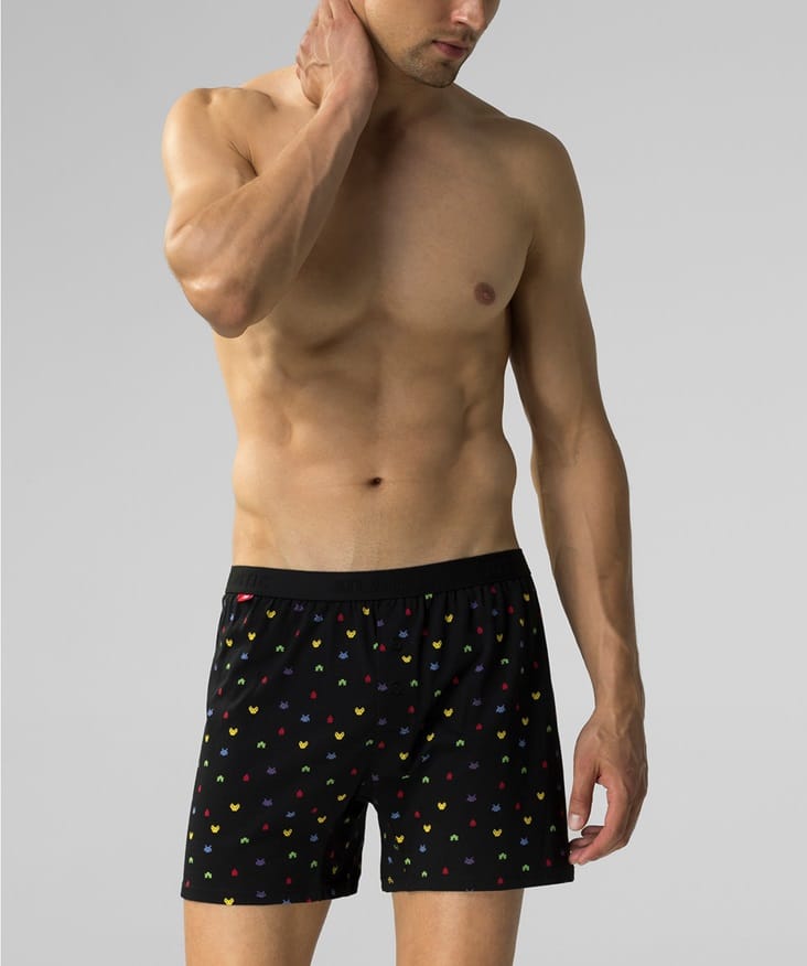 Bokserki męskie o luźnym kroju w delikatny wzorek. Bielizna odznacza się standardowej długości nogawkami oraz niską talią wykończoną szeroką gumą zewnętrzną. Z przodu zapinane na dwa guziki. Skład: 100% bawełna.