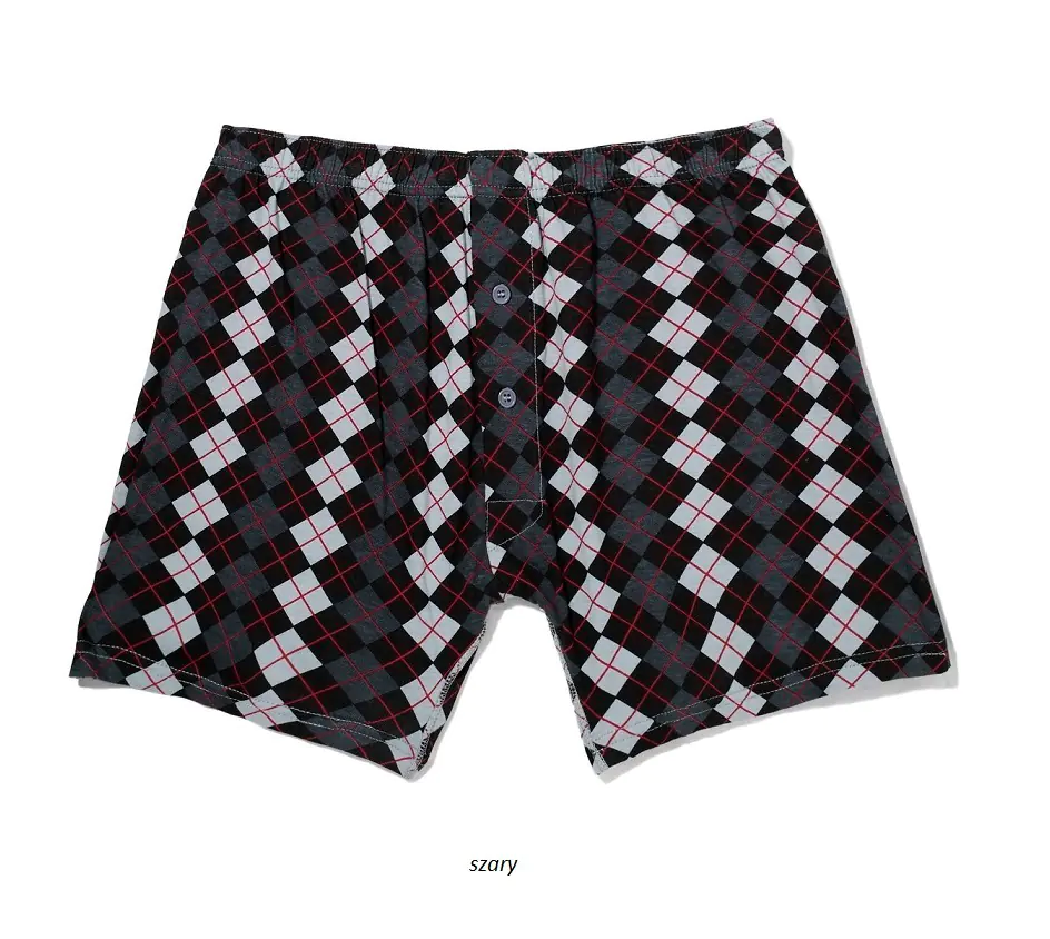 Wzorzyste bokserki męskie. Między nogawkami wszyty klin zapobiegający otarciom oraz podwyższający komfort noszenia. W pasie wygodna, nieuciskająca guma obszyta bawełną. Materiał: 100% bawełna.