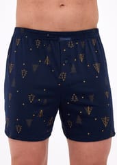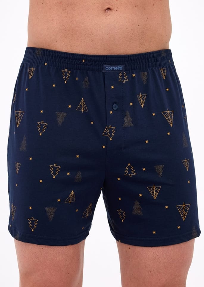 Bokserki męskie o luźnym fasonie ozdobione nadrukiem w choinki z lekkim akcentem świątecznym. Wygodna guma w pasie obszyta bawełną. Rozporek zapinany na guzik. Pakowane w pudełko, idealne na prezent. Skład: 100% bawełna.