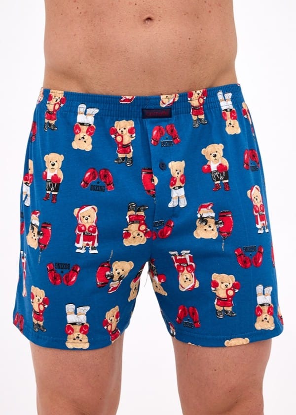 Bokserki męskie o luźnym fasonie ozdobione zabawnym nadrukiem w misie. Wygodna guma w pasie obszyta bawełną. Rozporek zapinany na guzik. Pakowane w pudełko. Skład: 100% bawełna.