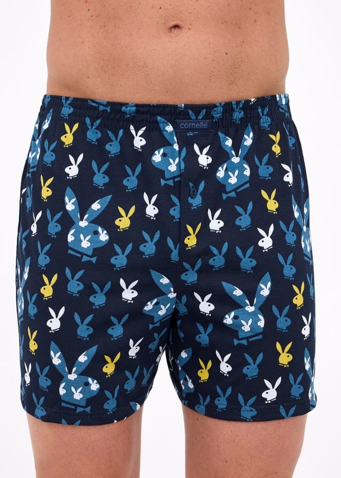 Bokserki męskie o luźnym fasonie ozdobione zabawnym nadrukiem we wzór w króliczki. Wygodna guma w pasie z logo. Rozporek zapinany na guzik. Skład: 100% bawełna.