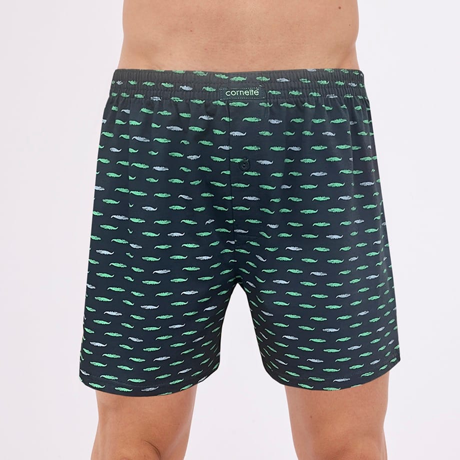 Bokserki męskie o wygodnym, luźnym fasonie ozdobione wzorem w krokodyle. Wygodna guma w pasie obszyta bawełną. Rozporek zapinany na guzik. Skład: 100% bawełna.