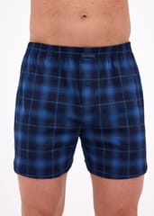 Bokserki męskie o luźnym fasonie w kratę. Wygodna guma w pasie obszyta bawełną. Rozporek zapinany na guzik. Skład: 100% bawełna.