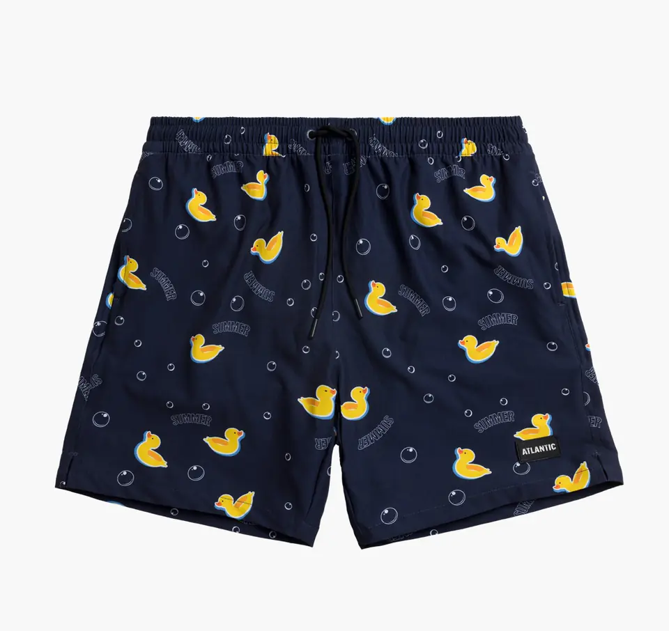 Szorty plażowe o standardowej długości nogawki, średniej wysokości talii oraz praktycznych kieszeniach po bokach, elastyczne wiązanie w pasie umożliwia dopasowanie do różnych typów sylwetek. Skład: 95% poliester, 5% elastan.