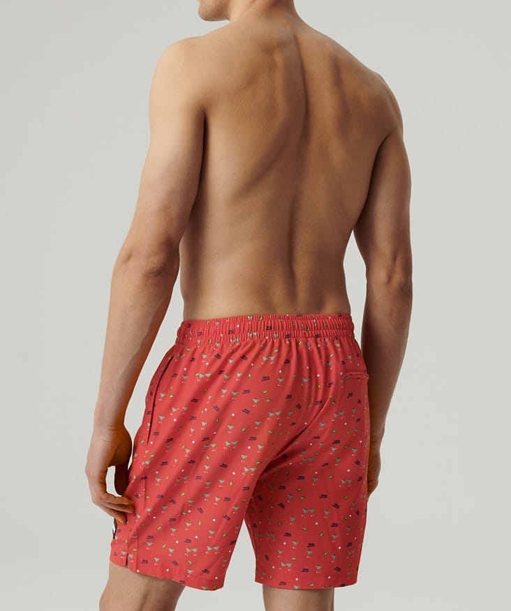 Szorty kąpielowe w wakacyjny nadruk o długości nogawek do połowy uda i średniej wysokości talii, wiązane w pasie na sznurek, po bokach mają kieszenie. Materiał szybkoschnący, rozciągliwy, włókna w technologii 4way stret . Skład: 96% poliester, 4% elastan.