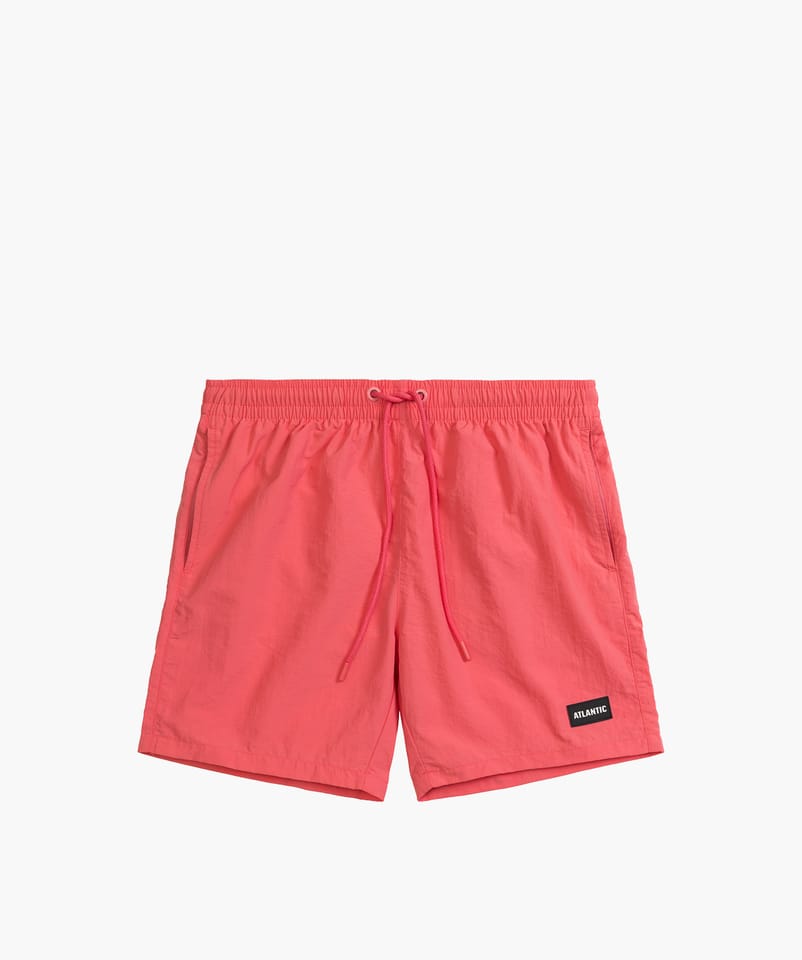 Szorty kąpielowe o długości nogawek sięgającej połowy uda i średniej wysokości talii, wiązane są w pasie na sznurek, po bokach mają kieszenie, a na lewej nogawce logo Atlantic. Materiał szybkoschnący, wysokojakościowy nylon. Skład:100% poliamid.