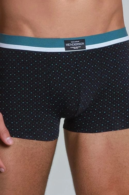 Ciemne bokserki męskie zdobione delikatnym nadrukiem na tkaninie, z ciekawą gumą w pasie w wydaniu duo-kolor. Szukasz czegoś modnego i wygodnego? - ta propozycja będzie idealna. Linia Henderson Premium. Skład: 95% bawełna, 5% elastan.
