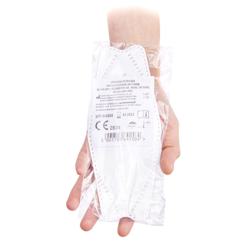 Oryginalna półmaska klasy FFP2 legalnie certyfikowana jako środek ochrony indywidualnej (PPE klasy III). Do ochrony dróg oddechowych przed pyłami i bakteriami i wirusami. Ergonomiczny kształt półmaski filtrującej FFP2 z zaokrąglonymi krawędziami, zapewnia lekką, komfortową i efektywną ochronę przed pyłami i bakteriami i wirusami. Wolna od lateksu, silikonu i PVC. Na gumki. Wykonana w technologii ultradźwiękowego łączenia, bez użycia kleju dzięki czemu jest bezzapachowa. Certyfikaty maski gwarantują ochronę indywidualną FFP2- niezawodna, skuteczna ochrona przed pyłami, mgłami, bakteriami i wirusami. Klasa ochrony FFP2 wg EN 149:2001+A1:2009 Półmaska filtrująca FFP2 NR do ochrony układu oddechowego przed cząstkami spełnia wymagania normy zharmonizowanej EN 149:2001+41:2009, którą zastosowano do wykazania zgodności z odpowiednimi wymaganiami unijnego prawodawstwa harmonizacyjnego tj. Rozporządzenia Parlamentu Europejskiego i Rady (UE) 2076/425 w sprawie środków ochrony indywidualnej. Efektywność filtracji >= 95 % zgodnie z normą EN149:2001 + A1:2009 CE 2834 Wiarygodne oznakowanie Conformité Européenne Środek ochrony osobistej - kategoria III wg Reg. 2016/245 Certyfikowany przez: CCQS Certification Services Limited, Irlandia certyfikowany przez jednostkę notyfikowaną uprawnioną do certyfikacji środków ochrony indywidualnej Nr certyfikatu: CE-PC-200313-045-01-9A ISO 9001 Wyjątkowa półmaska klasy FFP2 certyfikowana jako środek ochrony indywidualnej posiada 3 warstwy: 1) Warstwę wierzchnią o właściwościach antystatycznych, odpychających zanieczyszczenia. Włóknina polipropylenowa 60 g/ m2. 2) Warstwę meltblown. Warstwa wychwytuje z powietrza prawie 95% cząsteczek, o wielkości do 0,6 μm. Oznacza to, że maseczka chroni drogi oddechowe przed pyłem, dymem, cząsteczkami aerozolu oraz zmniejsza ryzyko zarażenia się wirusem. Tkanina została wykonana z wysokiej jakości materiałów o bardzo gęstym splocie, który nie przepuszcza pyłu oraz pary wodnej. Wychwytuje z powietrza prawie 95% zanieczyszczeń, zapewniając wysoki poziom bezpieczeństwa. Gwarantuje wysoką ochronę dróg oddechowych przed pyłem zawieszonym w powietrzu, tzw. pył PM 2,5, który wchodzi w skład smogu. 3) Warstwę twarzową. Z bardzo delikatnego materiału biokompatybilnego, hypoalergicznego również o właściwościach nieprzywierających i odpychających zanieczyszczenia. Wytrzymała, odporna na wgniatanie powłoka wewnętrzna zrobiona z włókniny polipropylenowej 30 g/m2. Certyfikowana półmaska filtrująca FFP2 jest komfortowa w noszeniu przez wiele godzin. Jeden rozmiar odpowiedni dla większości profili głowy. Wyjątkowo miękkie i wygodne gumki na uszy, które nie będą wywierać nacisku podczas użytkowania. Gąbka 3D- wkładka z hypoalergicznej gąbki dodatkowo chroniąca nos i uszczelniająca maskę. Kształtowane usztywnienie w okolicy nosa ukryte jest w konstrukcji by noszenie było jeszcze wygodniejsze. Bez zaworu wydechowego. Łączny czas stosowania: 8 godzin w komforcie. Maska charakteryzuje się obniżonymi oporami oddechowymi. Łatwiej wykonywać w niej codzienne czynności.
