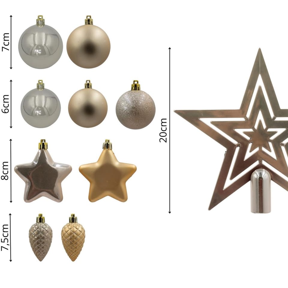 - W zestawie: - czubek gwiazda - 1szt, bombka/szyszka - 5szt/7,5cm, bombka o średnicy 6cm- 17szt., bombka o średnicy 8cm - 8szt., bombka o średnicy 7 cm - 9 szt., bombka gwiazdka o średnicy 8 cm -8szt.Materiał: tworzywo sztuczneKolor: kremowyWymiary opakowania (plastikowe pudełko): 22 x 12 x 27 cm ( śr. x wys.)Marka: MicaIlość w zestawie: 40 szt.