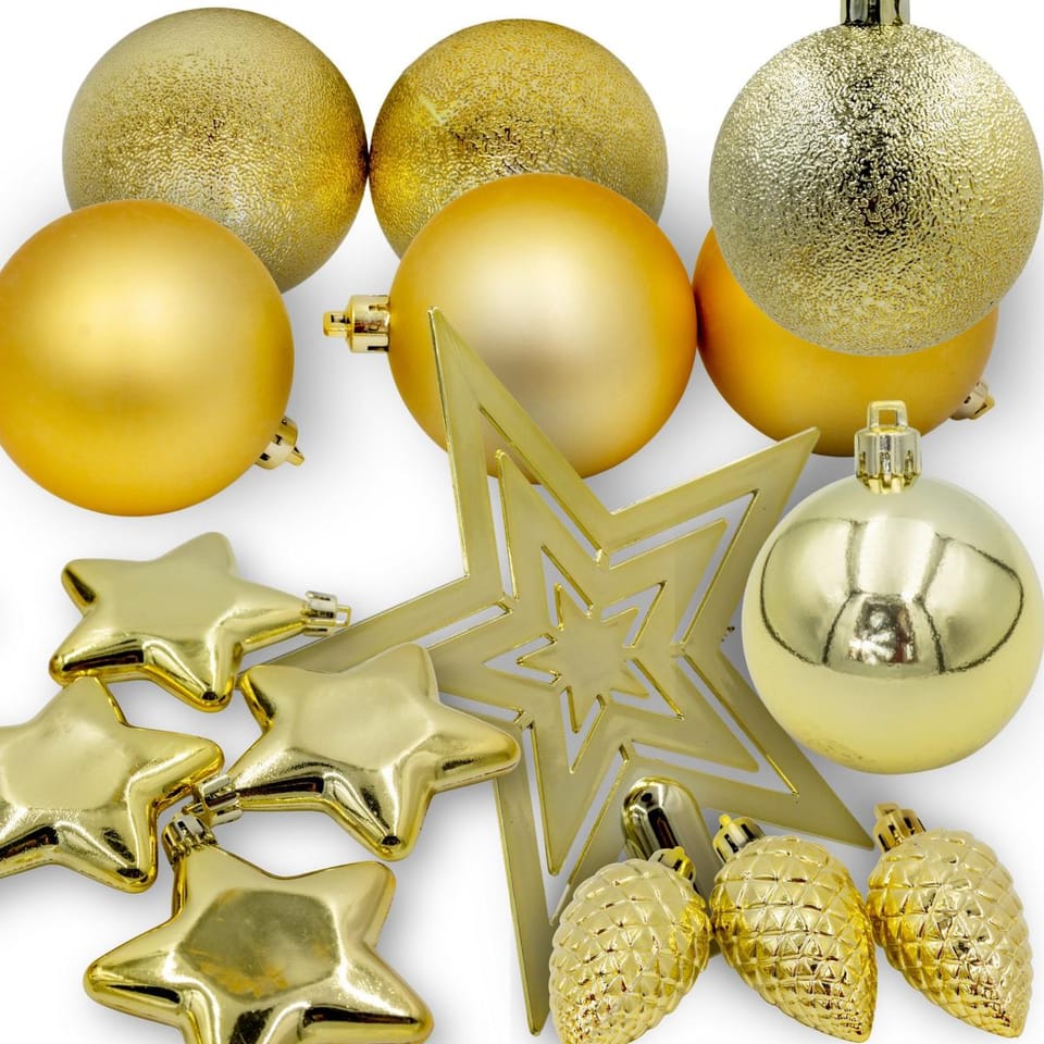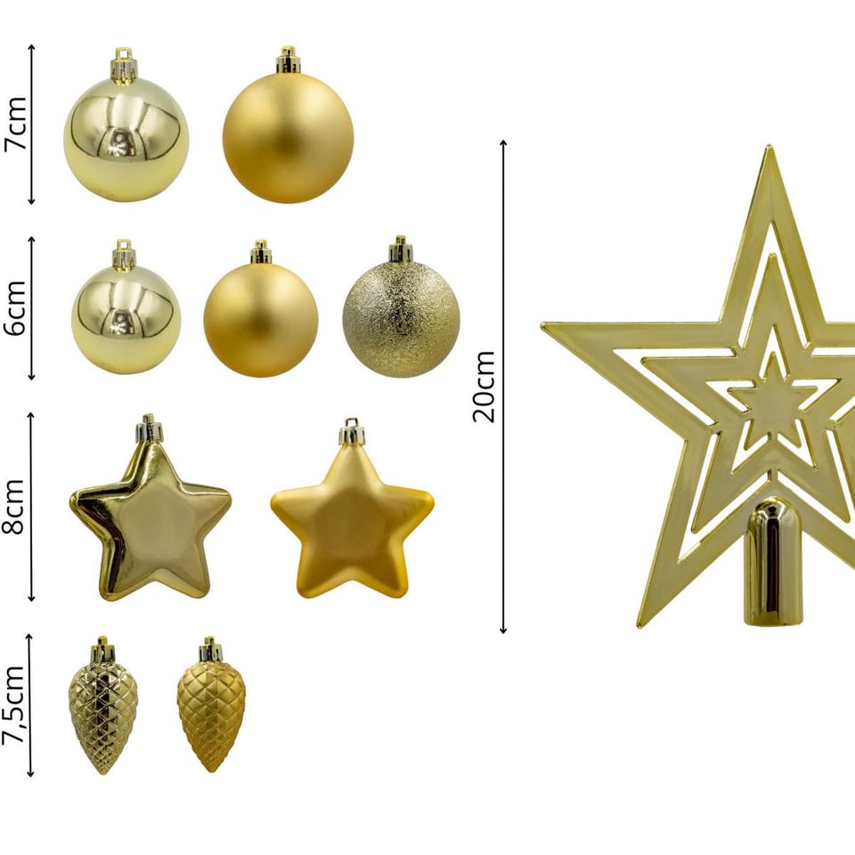 - W zestawie: - czubek gwiazda - 1szt, bombka/szyszka - 5szt/7,5cm, bombka o średnicy 6cm- 17szt., bombka o średnicy 8cm - 8szt., bombka o średnicy 7 cm - 9 szt., bombka gwiazdka o średnicy 8 cm -8szt.Materiał: tworzywo sztuczneKolor: złotyWymiary opakowania (plastikowe pudełko): 22 x 12 x 27 cm ( śr. x wys.)Marka: MicaIlość w zestawie: 40 szt.
