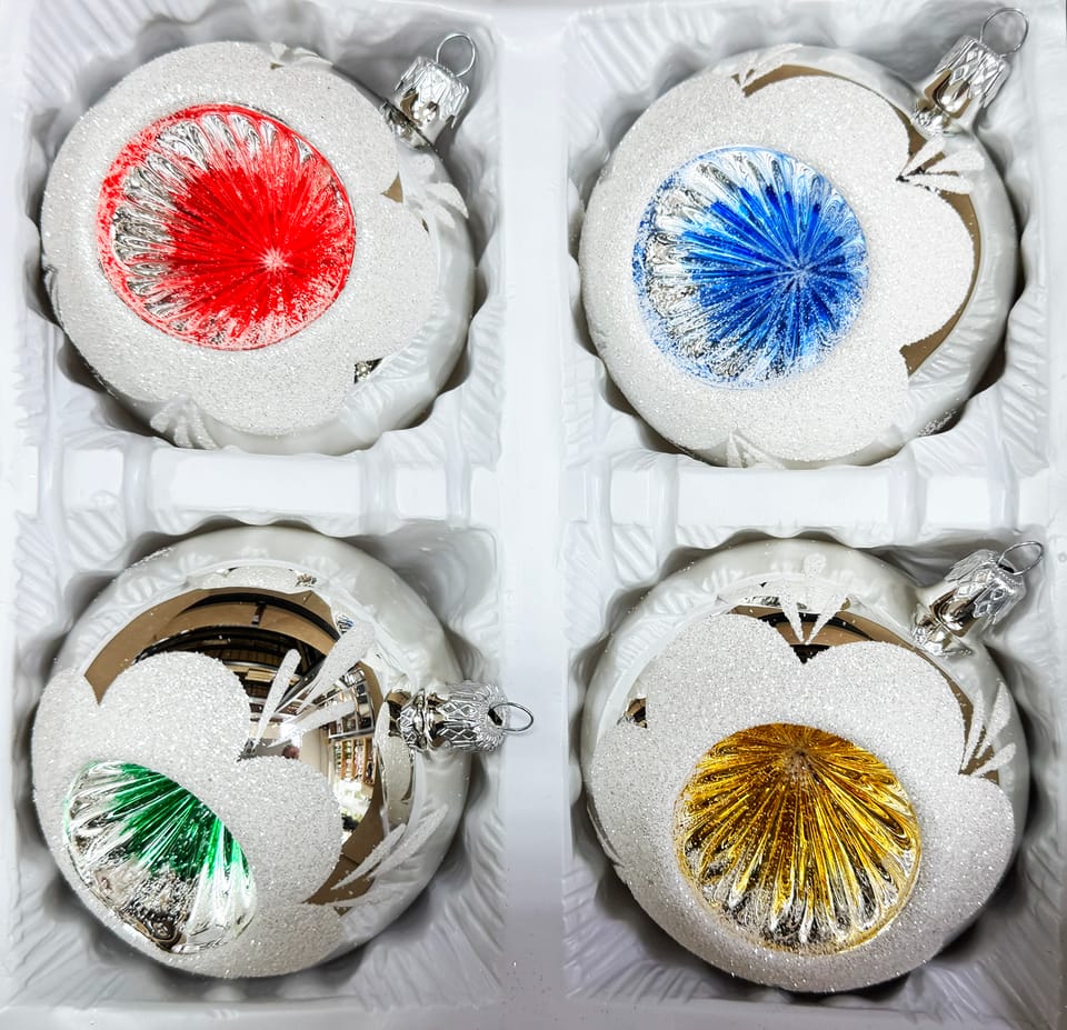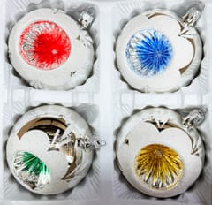 Powrót do przeszłości. Ręcznie wytwarzane i dekorowane bombki szklane z urokliwym reflektorem. Średnica 10 cm. Zestaw zawiera 4 sztuki. Produkt Polski. Walczmy z plastikiem, tylko szklane bombki mają w sobie to coś. Pomimo, że w opisie jest zdjęcie real, to ze względu na ręczne wykonanie, wzór i wymiar bombki może nieznacznie odbiegać od przestawionego na zdjęciu. Ręcznie nie da się bowiem zrobić, dwóch identycznych bombek. Myślę, że to jedna z ich zalet.
