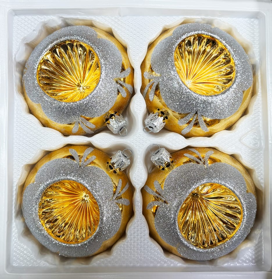 Powrót do przeszłości. Ręcznie wytwarzane i dekorowane bombki szklane z urokliwym reflektorem. Średnica 10 cm. Zestaw zawiera 4 sztuki. Produkt Polski. Walczmy z plastikiem, tylko szklane bombki mają w sobie to coś. Pomimo, że w opisie jest zdjęcie real, to ze względu na ręczne wykonanie, wzór i wymiar bombki może nieznacznie odbiegać od przestawionego na zdjęciu. Ręcznie nie da się bowiem zrobić, dwóch identycznych bombek. Myślę, że to jedna z ich zalet.