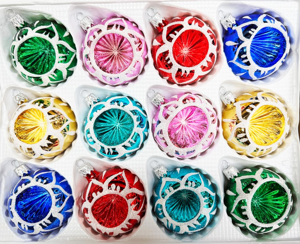 Takie bombki, to wspomnień czar. Ręcznie wytwarzane bombki szklane  z reflektorem. Średnica 6 cm. Zestaw zawiera 12 sztuk. Produkt Polski. Walczmy z plastikiem, tylko szklane bombki mają w sobie to coś. Pomimo, że w opisie jest zdjęcie real, to ze względu na ręczne wykonanie, wzór i wymiar bombki może nieznacznie odbiegać od przestawionego na zdjęciu. Ręcznie nie da się bowiem zrobić, dwóch identycznych bombek. Myślę, że to jedna z ich zalet.