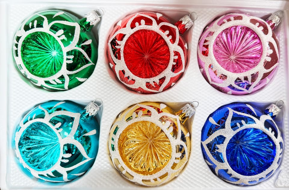 Takie bombki, to wspomnień czar. Ręcznie wytwarzane bombki szklane z reflektorem. Średnica 8 cm. Zestaw zawiera 6 sztuk. Produkt Polski. Walczmy z plastikiem, tylko szklane bombki mają w sobie to coś. Pomimo, że w opisie jest zdjęcie real, to ze względu na ręczne wykonanie, wzór i wymiar bombki może nieznacznie odbiegać od przestawionego na zdjęciu. Ręcznie nie da się bowiem zrobić, dwóch identycznych bombek. Myślę, że to jedna z ich zalet.