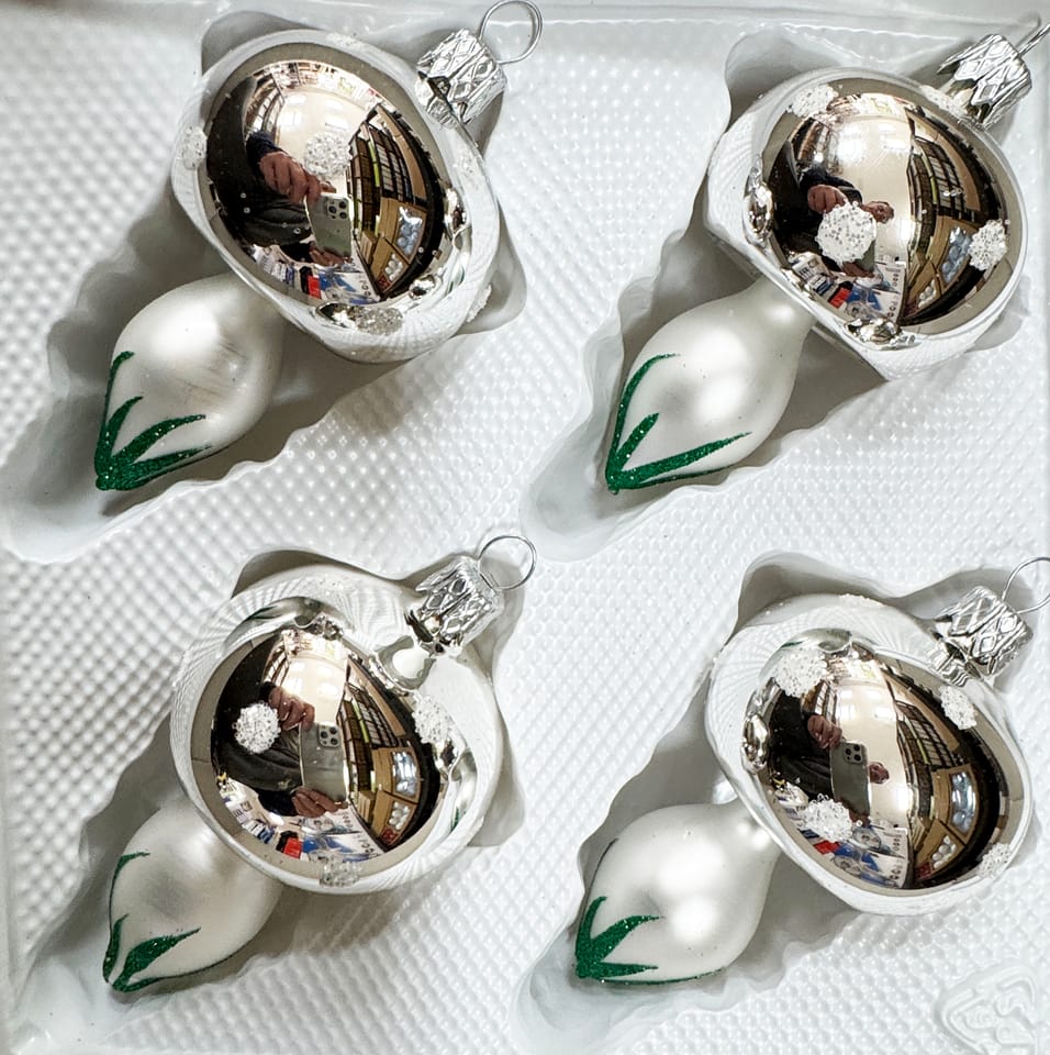Ręcznie wytwarzane i dekorowane bombki szklane. Zestaw zawiera 4 grzybki o wysokości ok. 9 cm. Produkt Polski. Walczmy z plastikiem, tylko szklane bombki mają w sobie to coś. Pomimo, że w opisie jest zdjęcie real, to ze względu na ręczne wykonanie, wzór i wymiar bombki może nieznacznie odbiegać od przestawionego na zdjęciu. Ręcznie nie da się bowiem zrobić, dwóch identycznych bombek. Myślę, że to jedna z ich zalet.