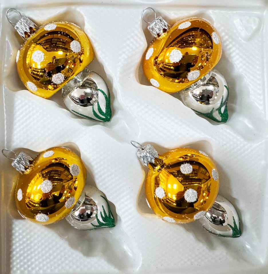 Ręcznie wytwarzane i dekorowane bombki szklane. Zestaw zawiera 4 grzybki o wysokości ok. 9 cm. Produkt Polski. Walczmy z plastikiem, tylko szklane bombki mają w sobie to coś. Pomimo, że w opisie jest zdjęcie real, to ze względu na ręczne wykonanie, wzór i wymiar bombki może nieznacznie odbiegać od przestawionego na zdjęciu. Ręcznie nie da się bowiem zrobić, dwóch identycznych bombek. Myślę, że to jedna z ich zalet.