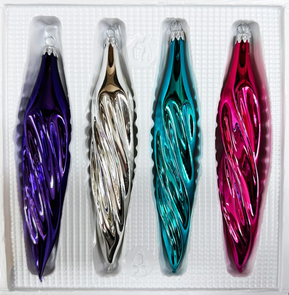 Ręcznie wytwarzane i dekorowane bombki szklane. Zestaw zawiera 4 sztuki skręconych sopli o długości ok. 12cm. Produkt polski. Walczmy z plastikiem, tylko szklane bombki mają w sobie to, świąteczne coś.