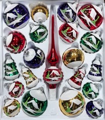Ręcznie wytwarzane i dekorowane bombki szklane. Zestaw zawiera 20 sztuk o wymiarach od 5 do 8cm plus czubek. Produkt Polski. Walczmy z plastikiem, tylko szklane bombki mają w sobie to coś. Pomimo, że w opisie jest zdjęcie real, to ze względu na ręczne wykonanie, wzór i wymiar bombki może nieznacznie odbiegać od przestawionego na zdjęciu. Ręcznie nie da się bowiem zrobić, dwóch identycznych bombek. Myślę, że to jedna z ich zalet.