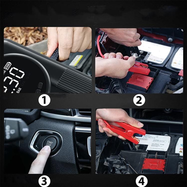 - Typ urządzenia: wielofunkcyjne urządzenie awaryjne 4 w 1: rozrusznik 12 V, kompresor, powerbank i latarka LED.