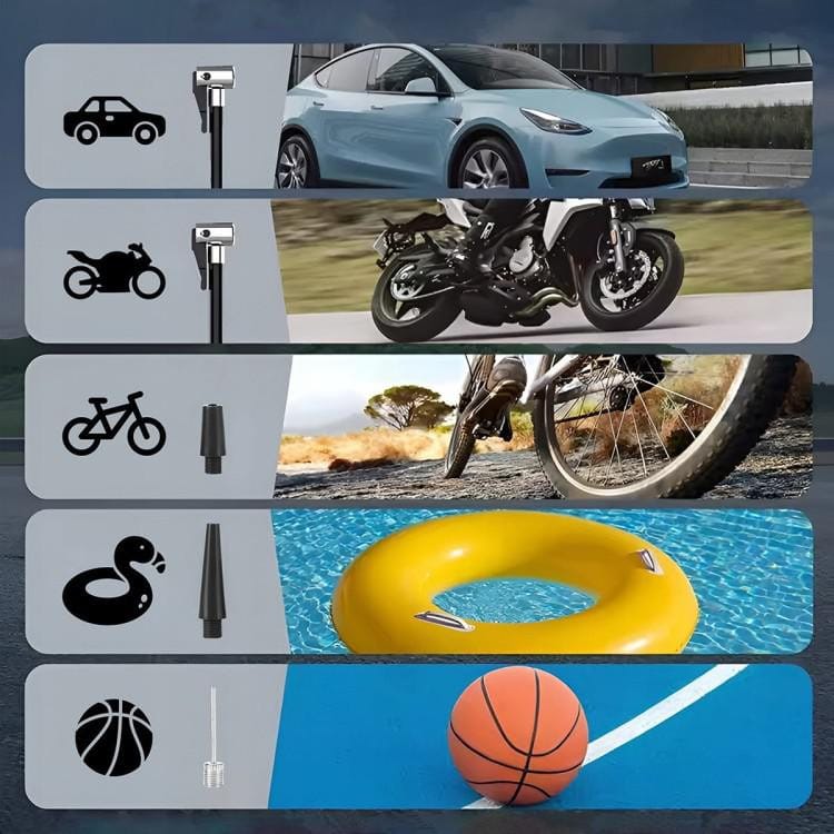 - Wyświetlacz: LCD – pokazuje poziom naładowania, napięcie i ciśnienie powietrza.