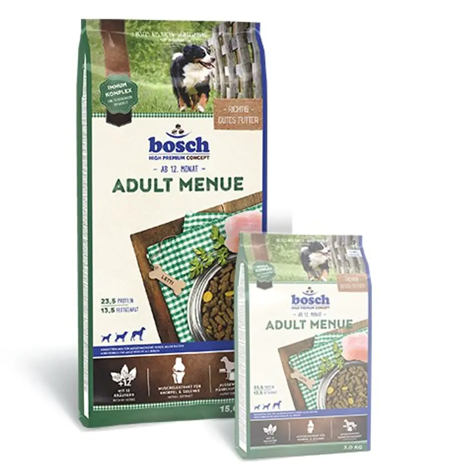 Rozpieść Twojego psa, podając mu Bosch Adult Menue, wysokojakościową karmę dla psów o normalnej aktywności.