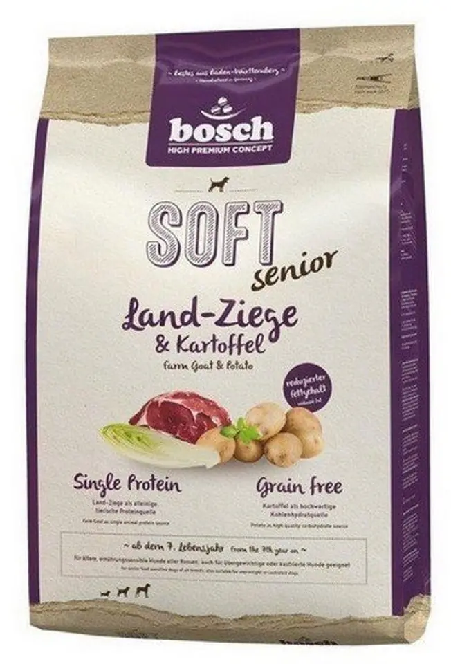 Bosch Soft Senior Kozina & ziemniakSkład:świeże mięso z kozy (20%), mąka ziemniaczana (20%), skrobia ziemniaczana, białko z ziemniaka, celuloza, groch suszony, pulpa buraczana (bez cukru), białko grochu, tłuszcz z drobiu, fosforan dwuwapniowy, hydrolizat białka roślinnego, siemię lniane, suszone drożdże piwne, nasiona psyllium, chlorek sodu, suszona cykoria (0,1%), glukozamina, siarczan chondroitynyAnaliza: