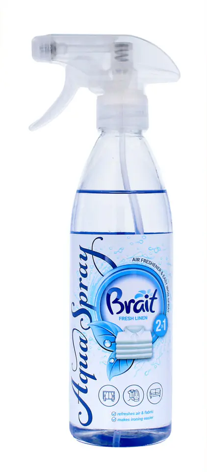 Brait Aqua Spray to odświeżacz do powietrza, tkanin i mebli, który delikatnie usuwa zapachy, pozostawiając lekki, świeży zapach. Formuła na bazie wody, ma 0% alkoholu i nie zawiera ciężkich perfum. Dodatkowo możesz go używać jako sprayu ułatwiającego prasowanie, dzięki czemu możesz cieszyć się wyśmienitym zapachem na tkaninie.