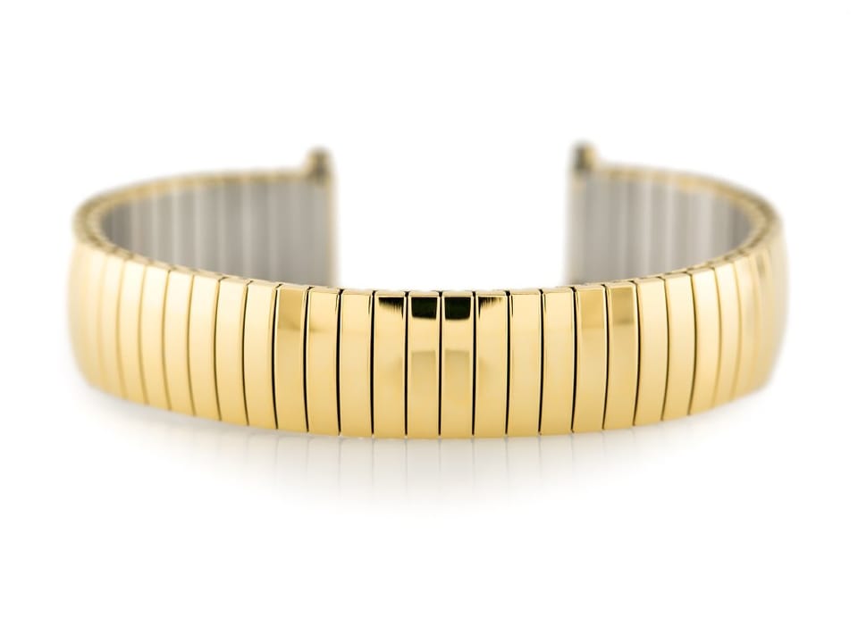 OPIS:Metalowa bransoletka wysokiej jakości w kolorze złotym z możliwością rozciągnięcia oraz z regulacją szerokości mocowania.