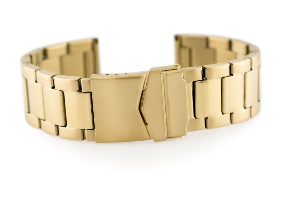 OPIS:Stalowa bransoleta do zegarka wysokiej jakości w kolorze złotym.Możliwość skrócenia bransolety poprzez usunięcie ogniw - można usunąć maksymalnie 8 ogniw, szerokość jednego ogniwa to ok. 10mm.Bransoleta posiada zabezpieczenie przed przypadkowym otwarciem.