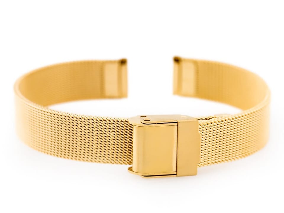 Stalowa bransoletka do zegarka typu 'siatka' wysokiej jakości w kolorze złotym. Powlekana metodą PVD.