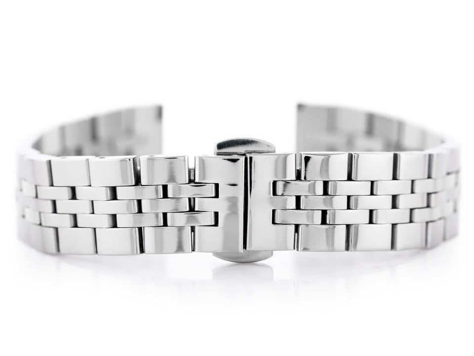 Stalowa bransoletka z zapięciem motylkowym do zegarka wysokiej jakości w kolorze srebrnym.