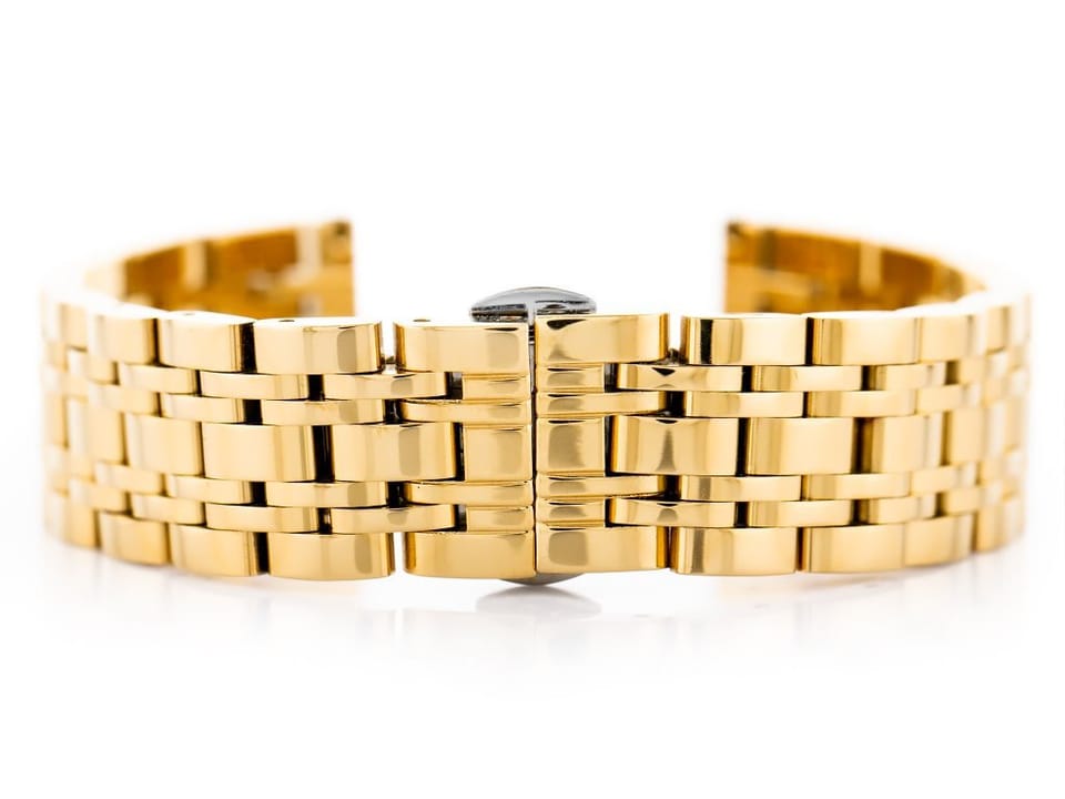 Stalowa bransoletka z zapięciem motylkowym do zegarka wysokiej jakości w kolorze złotym.