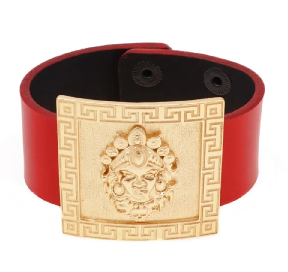 Najnowsza kolekcja! Skórzana bransoletka z ręcznie tworzoną, kwadratową klamrą pozłącaną. Motym hinduskiej bogini Kali. Długość bransoletki minimalna 18cm, maksymalna 20cm, szerokość 3,3cm, klamra 5,2x5,2 cm, grubość 0,3 cm.