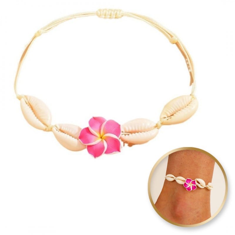 Bransoletka 2w1 na stopę i rękę, na sznurku, MUSZELKI i KWIAT HAWAJSKI B542F