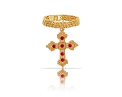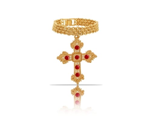 Pozłacana bransoletka z krzyżem ręcznie zdobionym czerwoną emalią i kryształkami Preciosa. Wymiary bransoletki 16,5 cm. Wielkość krzyża 6 cm/ 5 cm.