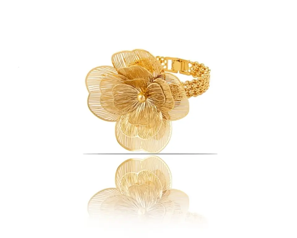 Pozłacana bransoletka typu Bismark z trójwymiarowym kwiatem to elegancka i wyjątkowa biżuteria. Długość bransoletki ok 16 cm.