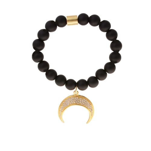 Bransoletka z czarnych onyksów na gumce. Minimalna długość 22 cm. Zawieszka ksieżyc ręcznie wyklejana kryształami.