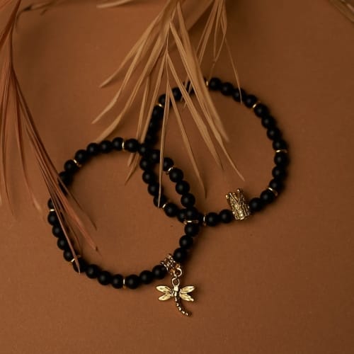 Bransoletka na gumce z czarnymi onyksamii i złotymi przekładkami. Zawieszka ważka 2cm wysokości. Maksymalna długość bransoletki 18cm.
