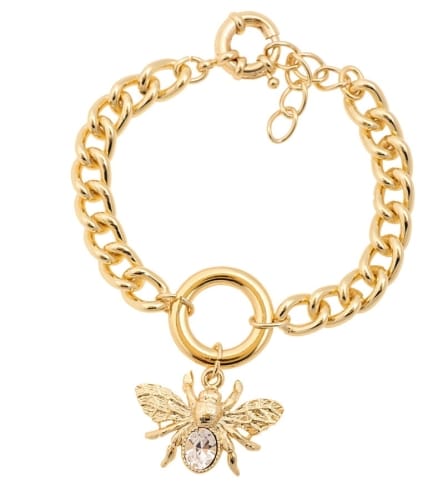 Bransoletka z masywnego łańcucha z muchą i kryształem w kolorze klasycznym. Długość bransoletki 16 cm + przedłużka 4 cm.Wielkość muchy 3 x 2 cm
