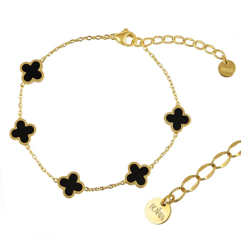 Bransoletka na rękę stal chirurgiczna pozłacana 14k złotem czarna, koniczynki BST1570