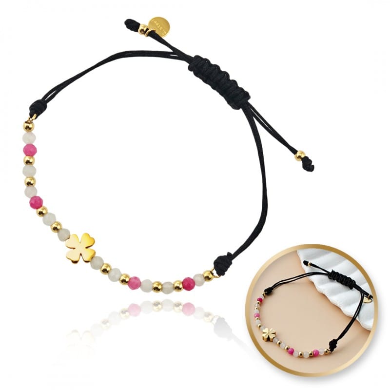 Bransoletka na rękę stal chirurgiczna pozłacana 14k złotem, koniczynka na czarnym sznurku- BST1548