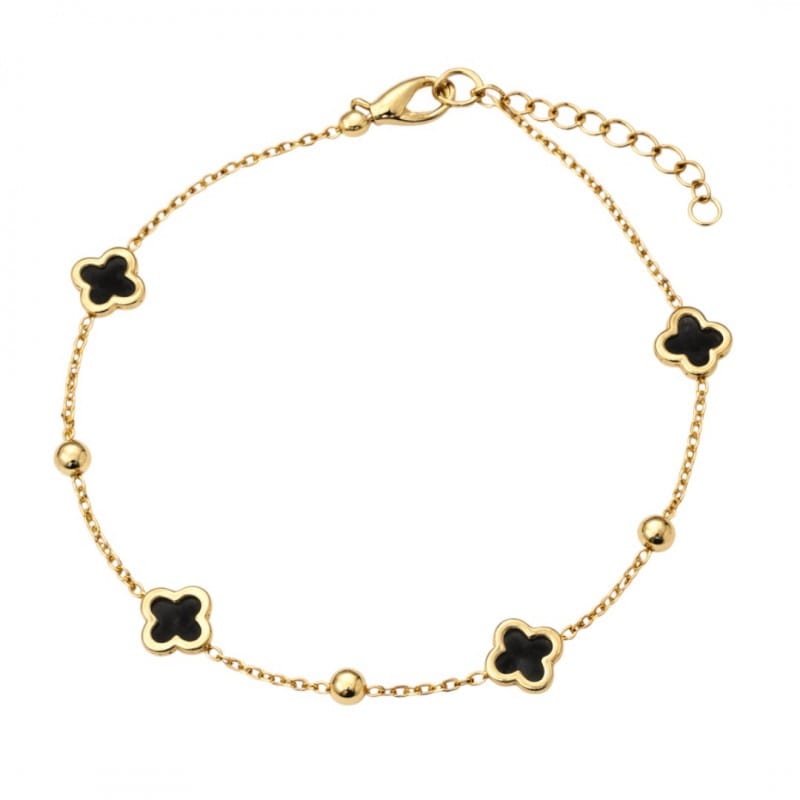 Bransoletka na rękę stal chirurgiczna pozłacana 14k złotem, koniczynki czarne BST1598