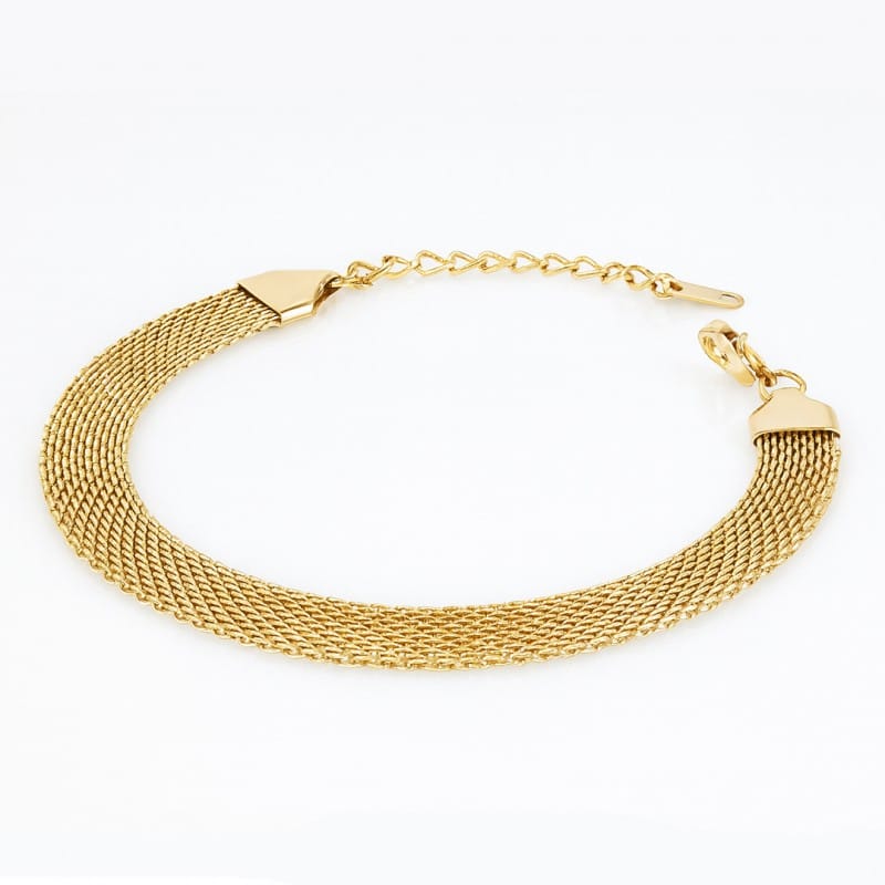 Modna bransoletka ze stali nierdzewnej platerowana 14 karatowym złotemŚwietnie pasuje do eleganckich, jak również do codziennych stylizacjiElegancki dodatek na każdą okazję, do sukienek, spódnic, spodenek. Wymiary:17 cm + 5 cm regulacja Wymiar kartonika:10 cm x 8 cm Waga:5g netto / 11 g brutto STAL CHIRURGICZNA jest odporna na warunki atmosferyczne, nie ulega korozji, nie rdzewieje, nie śniedzieje.