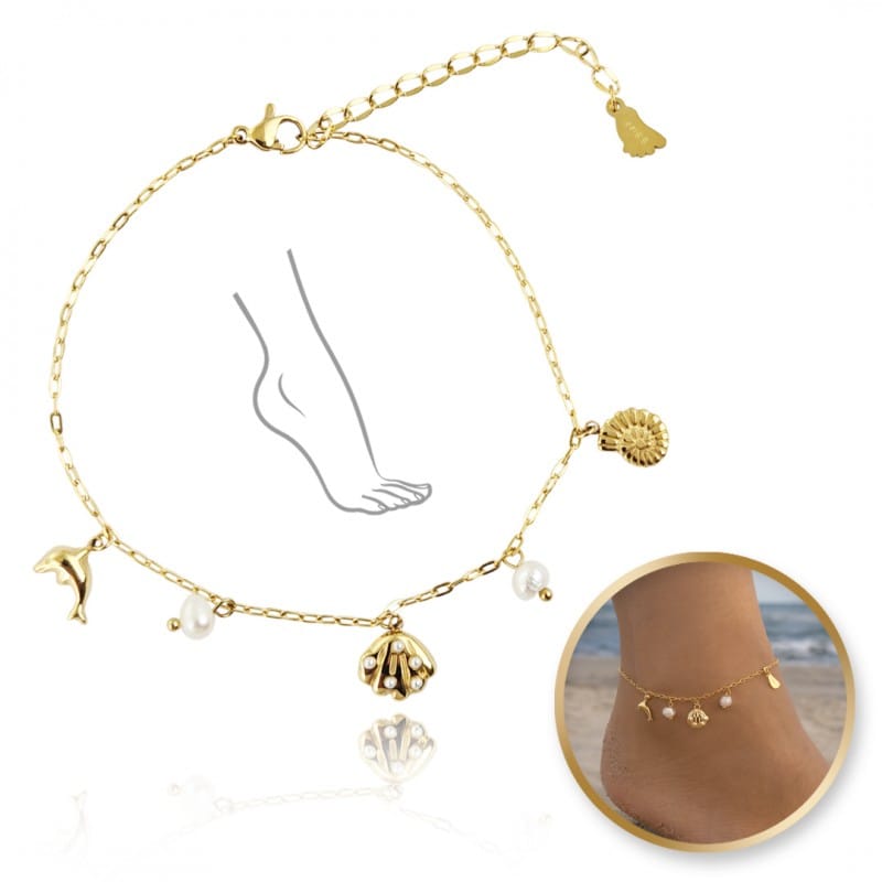 Bransoletka na stopę stal chirurgiczna pozłacana 14k złotem, muszle perły - BST1562